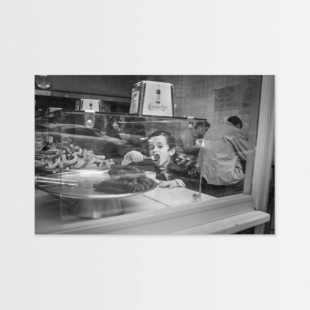 Fine Art print: Candid Street Photography of a kid enjoying "chocolate a la taza" in a churros shop at Via Laietana in Barcelona, Spain.