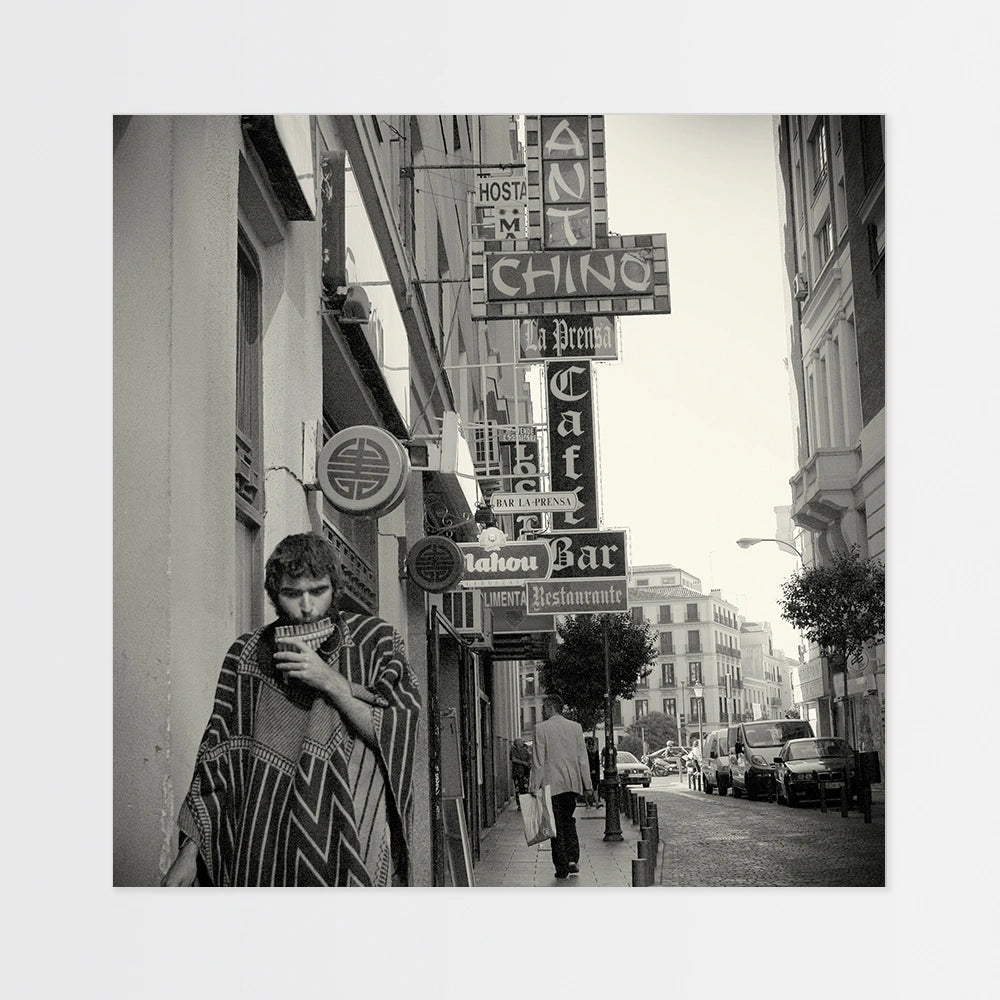Fine Art print: Candid shot of Man playing panflute in Madrid